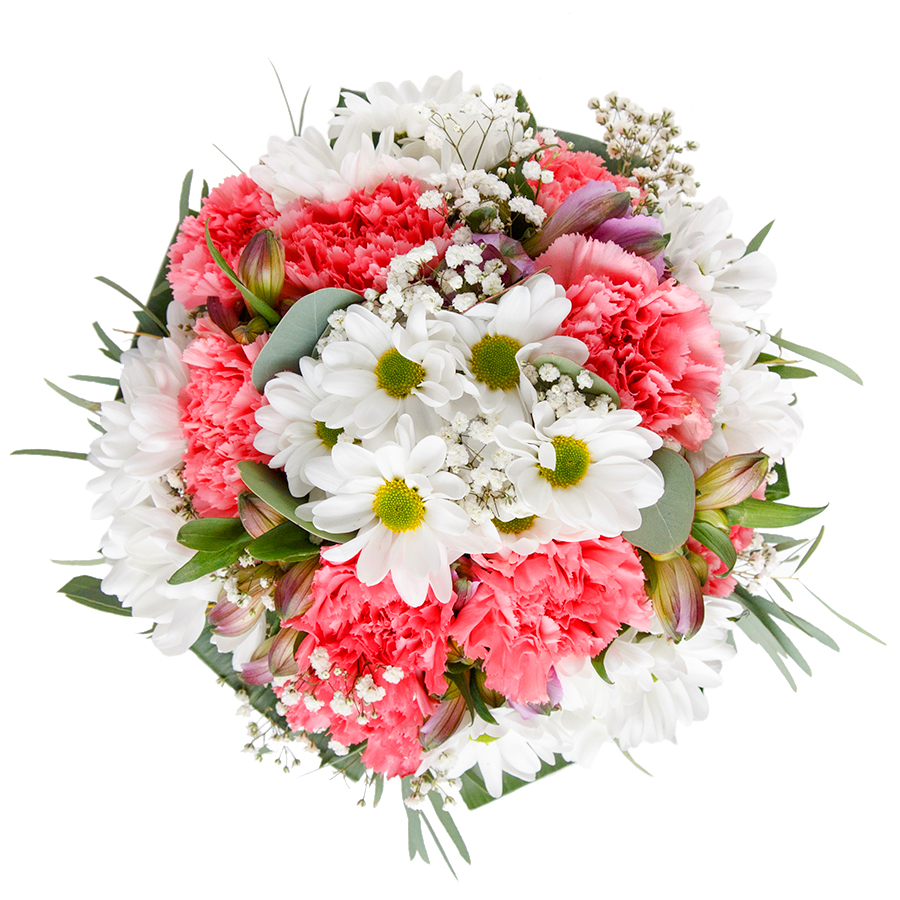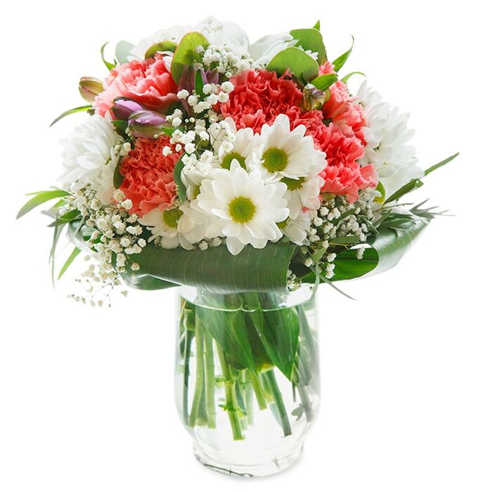 Brighten someone's day with our charming seasonal bouquet. This delightful arrangement combines snow-white chrysanthemums, delicate gypsophila, and soft light pink carnations, all gracefully wrapped in vibrant aspidistra leaves.